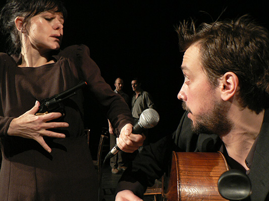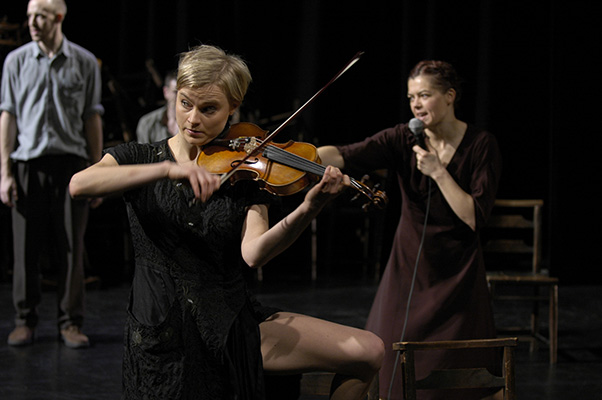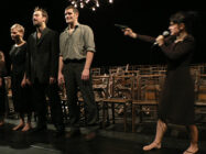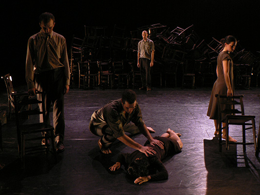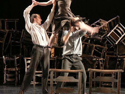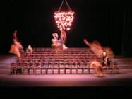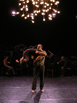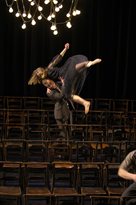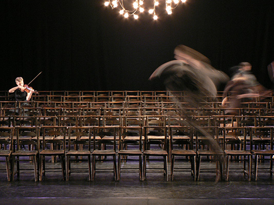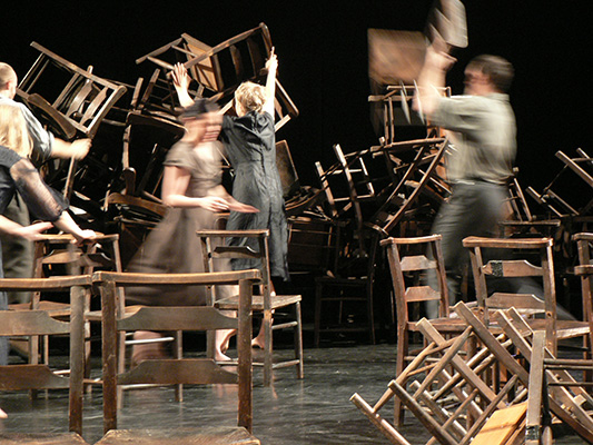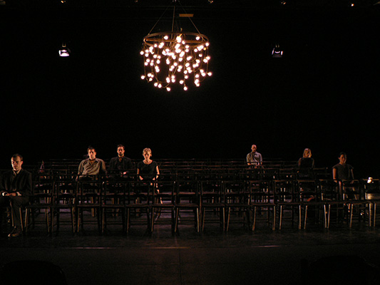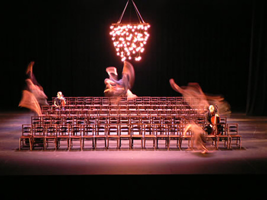 Set amongst rows of wooden chairs, with a huge chandelier hanging overhead, Broken Chords is a visually striking portrait of breaking up and breaking down by an international, multi-tasking ensemble of performers.
