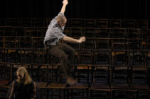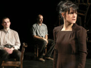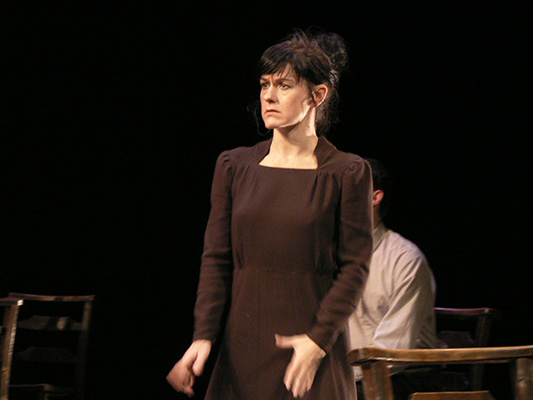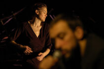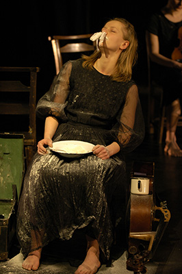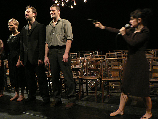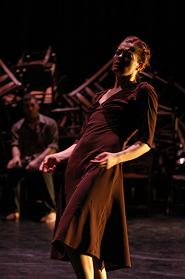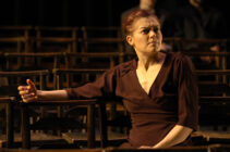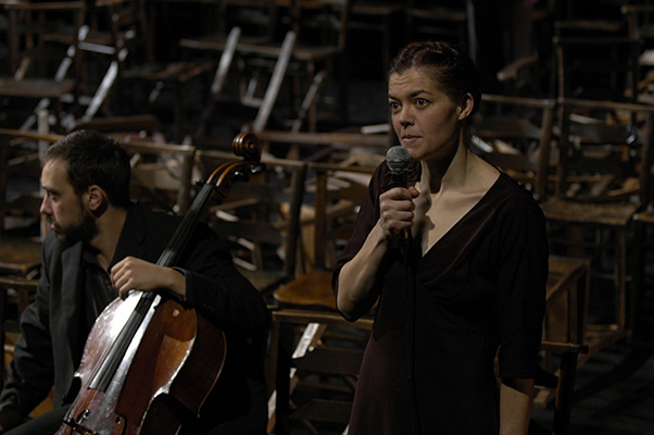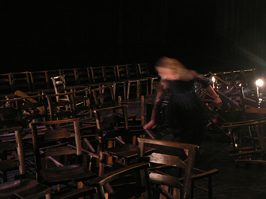 “Rows of wooden chairs fill the stage. There must be over a hundred of them. A huge cluster of lightbulbs pretends to be a chandelier. Two soft chords are repeating: low-high, low-high. Patrycja Kujawska, barefoot and wearing a dark dress, makes her way slowly, bent over, between the first two rows of chairs.”